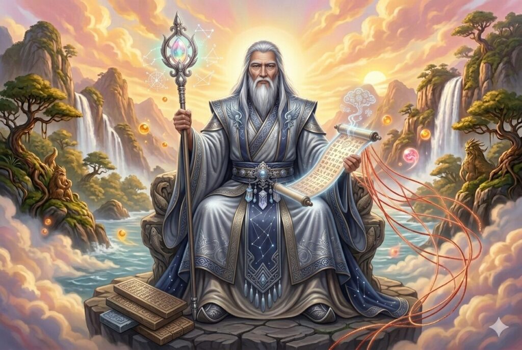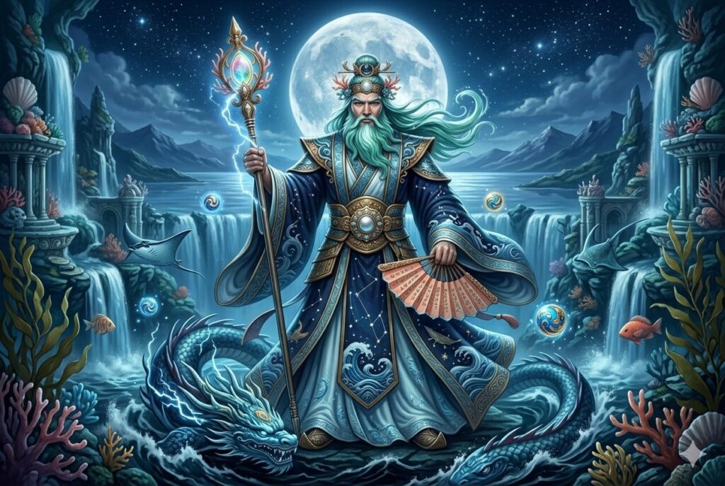 ワタツミノカミは日本神話における海の神(海神)で、イザナギの禊から生まれた神々の中の一柱です。海底の竜宮城(わたつみの宮)に住み、海の生き物たちを支配するとされます。山幸彦(ホオリ)が兄の釣り針を探して海に入った際に迎え入れ、娘のトヨタマヒメを妻にしたというエピソードが有名です。この縁から皇室の祖先ともつながり、海上の守護神として漁師や船乗りに厚く信仰されてきました。志賀海神社(福岡県)が全国ワタツミ神社の総本社とされています。