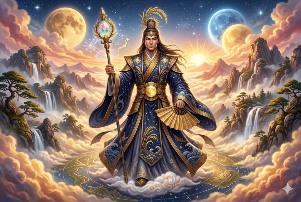 カムヤマトイワレビコノミコトは、日本神話における初代天皇「神武天皇」として知られる英雄的な神です。天孫ニニギの曾孫にあたり、日向(宮崎)から大和(奈良)へと東征の旅を行い、各地の豪族を制して大和国を建国したとされます。その東征の途中、タケミカヅチから剣を授けられ、ヤタガラス(三本足の烏)の道案内を受けたというエピソードも有名です。紀元前660年の即位は「建国記念の日(2月11日)」の由来とされており、橿原神宮(奈良県)に祀られています。